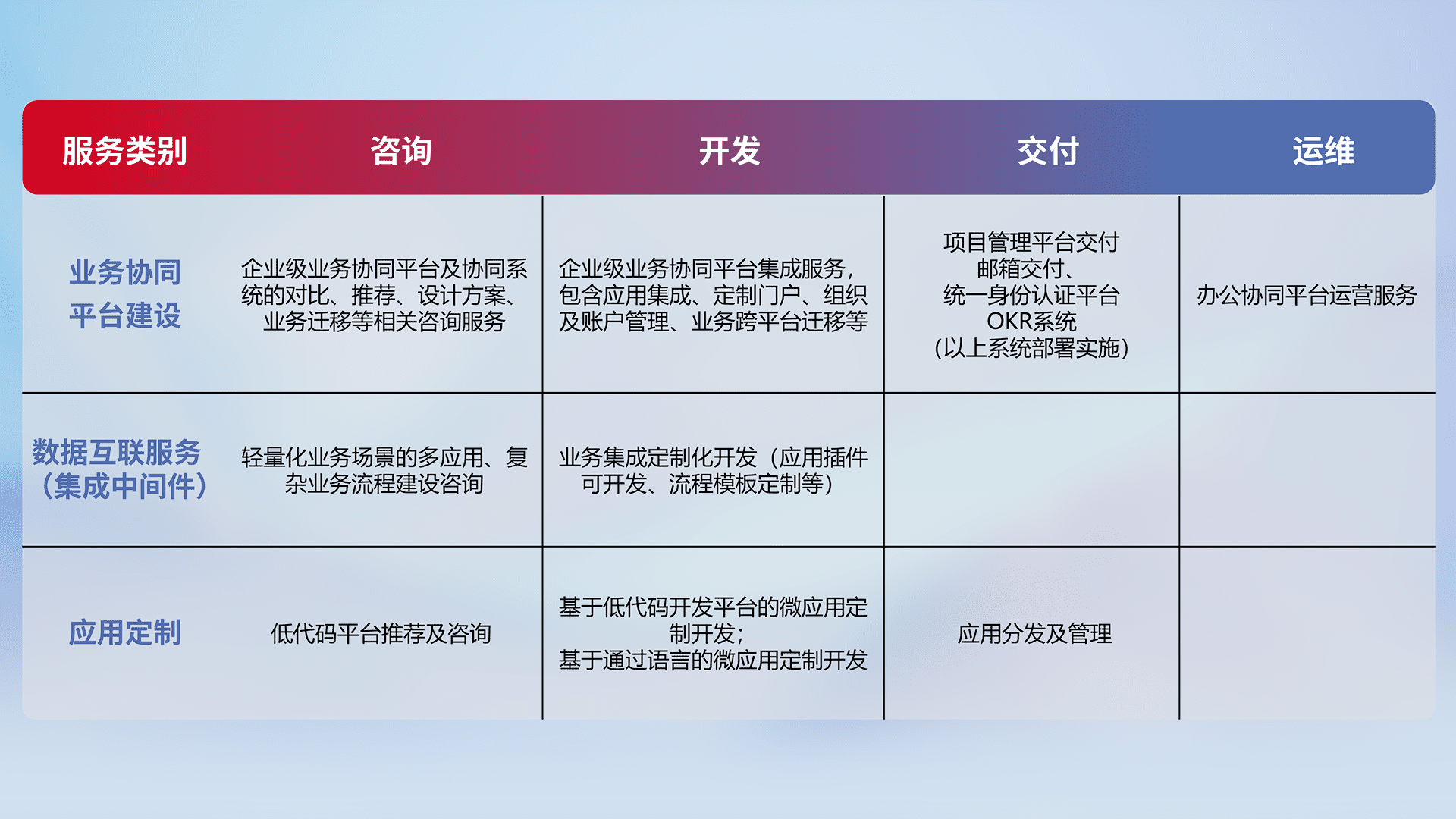 针对钉钉、、、企微、、IDaas等平台级产品提供产品的规划、、、方案、、、、交付、、、定制化开发等服务,,实现如统一协同办公、、、智能客户服务、、混合会议管理、、、智能数据查询、、、、等业务场景,,,实现数字化转型。。。。