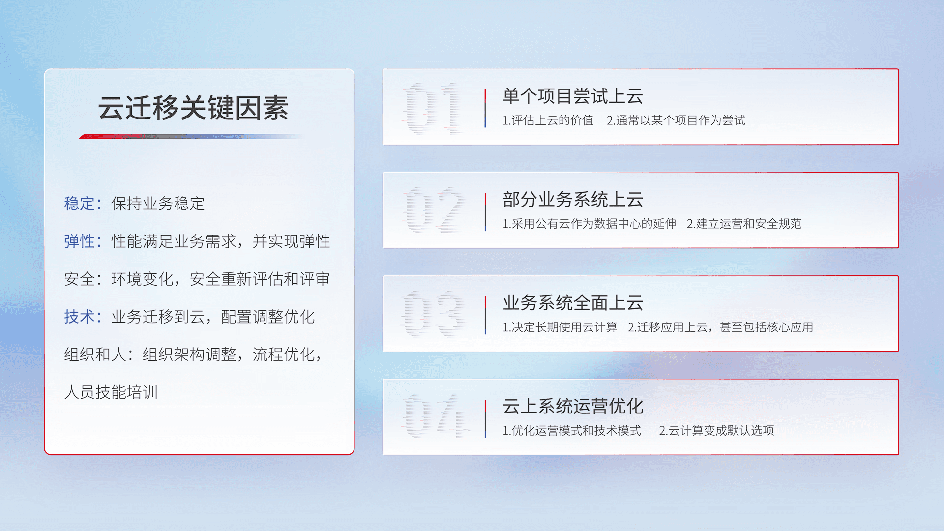 结合实际业务,,从规划设计、、、、云平台选型、、、、云原生改造、、、、数据迁移、、集成交付,,迁移全过程为客户识别最佳上云路径,,,做好风险识别管理,,,,设计网络架构、、、、身份权限、、、、安全审计合规、、操作审计、、日志审计、、监控告警策略、、多站点容灾设计等,,,,对云上基础设施进行整体规划,,,提升IT治理水平,,以满足弹性、、、高可用、、高性能的需求。。。